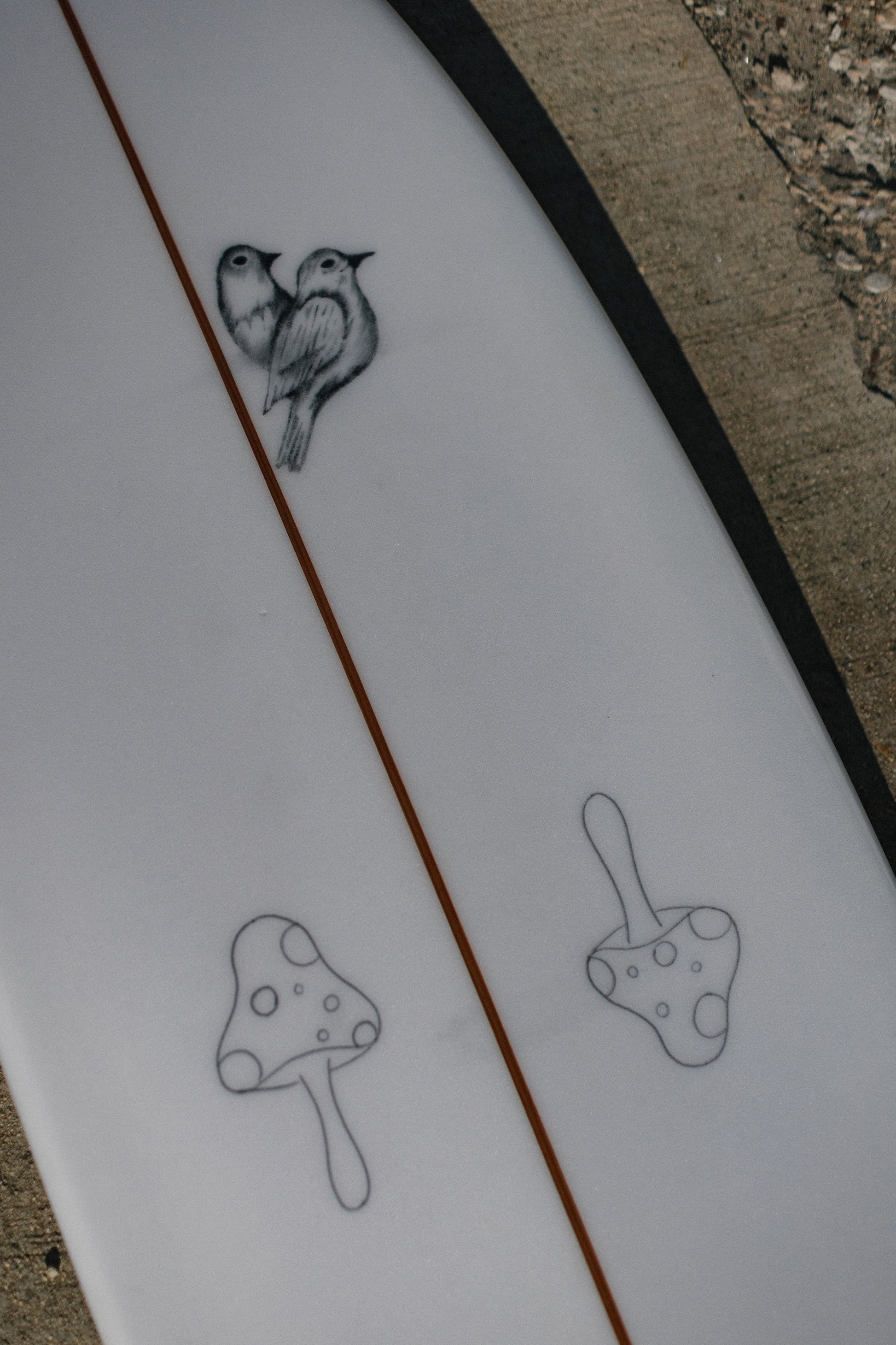 From the shaping bay of Brothers Marshall Surf Shop come these one-off surfboards, each entirely hand-shaped by Keegan Gibbs. After shaping, the foam blanks are passed to Mike Giglotti, who adds charcoal embellishments by hand, turning every board into a functional piece of art.