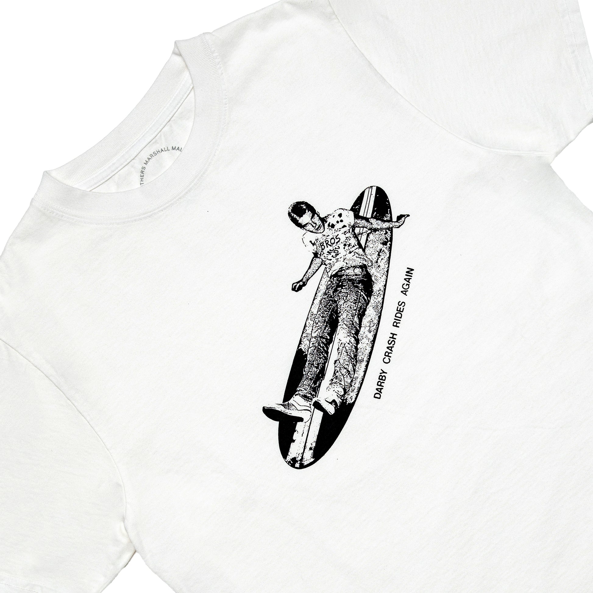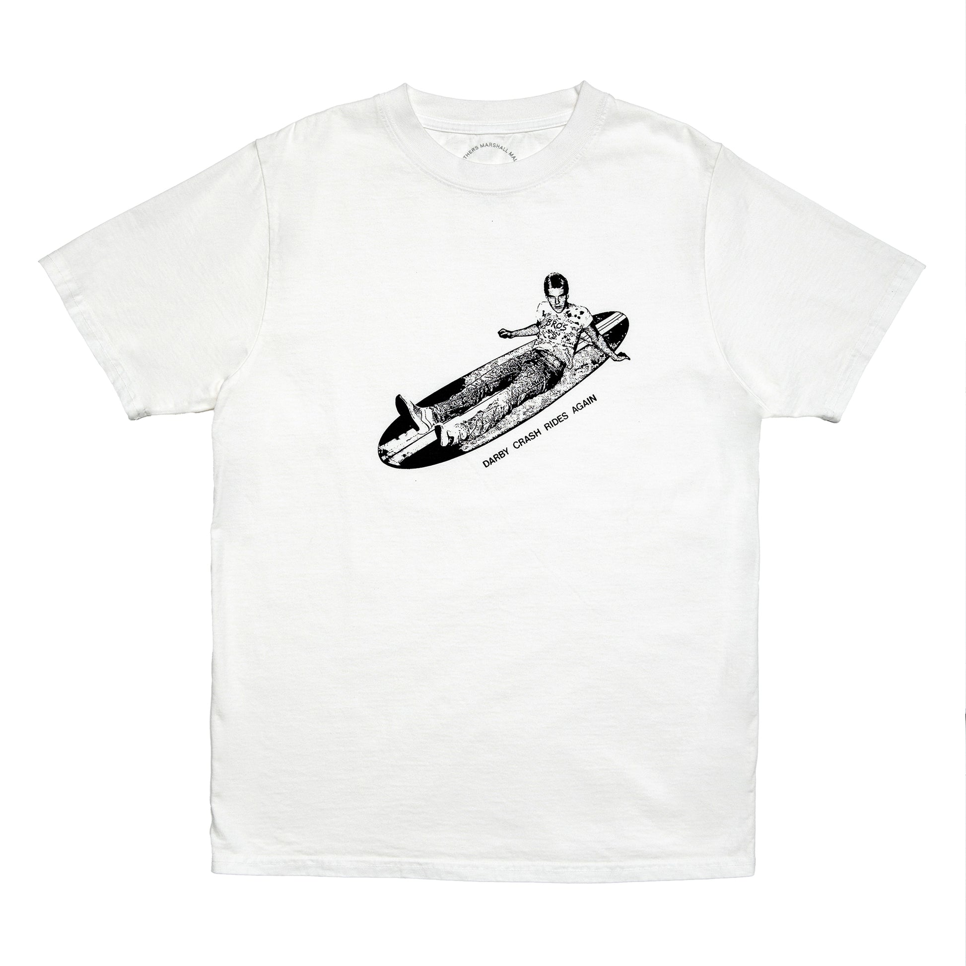Darby Crash, the late frontman of The Germs, is captured laid out on a surfboard—an image that feels as confrontational as the band itself. As one of Los Angeles’ first punk bands, The Germs helped define the raw, reckless energy that shaped punk culture worldwide. This shirt embodies that uncompromising FUCK YOU attitude, channeling a spirit of defiance that carries seamlessly from the streets to the water.